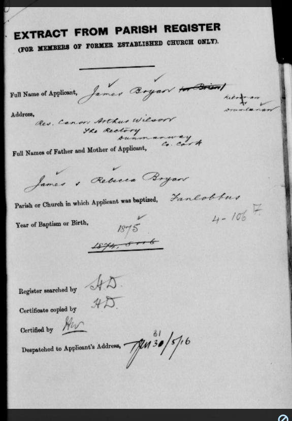 Pre 1922, Pension Enquiry Forms Church of Ireland Fanlobbus and Coolkelure (Dunmanway) West Cork. 08 Thursday Sep 2016 Original size at 575 × 830 ≈ Leave a comment