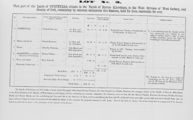 1862. Sale in Landed Estates Court of Charles Evanson Estate, 5 Gneeves at Gurteneas (Akahista, name reputedly given by Kilcrohane Poet Aonghus Ó Dalaigh), Bantry, Including Tenant Listing Richard Tobin of ‘King Tobin Family Kilcrohane, former tenant Dr. Daniel O’Donovan. 1862. Including Tenant Listing Richard Tobin of ‘King Tobin Family Kilcrohane, former tenant Dr. O’Donovan.