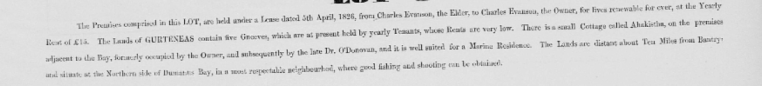 1862. Sale in Landed Estates Court of Charles Evanson Estate, 5 Gneeves at Gurteneas (Akahista, name reputedly given by Kilcrohane Poet Aonghus Ó Dalaigh), Bantry, Including Tenant Listing Richard Tobin of ‘King Tobin Family Kilcrohane, former tenant Dr. Daniel O’Donovan. 1862. Including Tenant Listing Richard Tobin of ‘King Tobin Family Kilcrohane, former tenant Dr. O’Donovan.