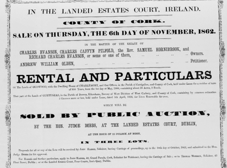1862. Sale in Landed Estates Court of Charles Evanson Estate, 5 Gneeves at Gurteneas (Akahista, name reputedly given by Kilcrohane Poet Aonghus Ó Dalaigh), Bantry, Including Tenant Listing Richard Tobin of ‘King Tobin Family Kilcrohane, former tenant Dr. Daniel O’Donovan. 1862. Including Tenant Listing Richard Tobin of ‘King Tobin Family Kilcrohane, former tenant Dr. O’Donovan.