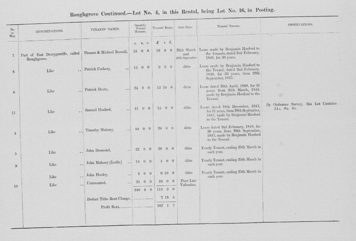 1851 Landed Estate Sale of Roughgrove/Derrygariff, Within Two Miles of Bandon Co.Cork c 400 acres Originating Fee Farm Grant of 1610 Sir Bernard Granville to Giles Maskelyn and Sub Leases 1612-1625, Maps Tenant Listings.