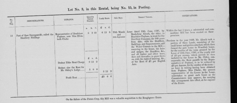 1851 Landed Estate Sale of Roughgrove/Derrygariff, Within Two Miles of Bandon Co.Cork c 400 acres Originating Fee Farm Grant of 1610 Sir Bernard Granville to Giles Maskelyn and Sub Leases 1612-1625, Maps Tenant Listings.