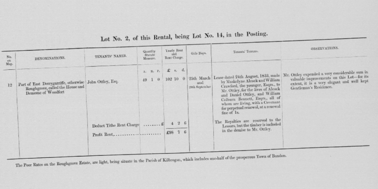 1851 Landed Estate Sale of Roughgrove/Derrygariff, Within Two Miles of Bandon Co.Cork c 400 acres Originating Fee Farm Grant of 1610 Sir Bernard Granville to Giles Maskelyn and Sub Leases 1612-1625, Maps Tenant Listings.
