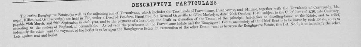 1851 Landed Estate Sale of Roughgrove/Derrygariff, Within Two Miles of Bandon Co.Cork c 400 acres Originating Fee Farm Grant of 1610 Sir Bernard Granville to Giles Maskelyn and Sub Leases 1612-1625, Maps Tenant Listings.