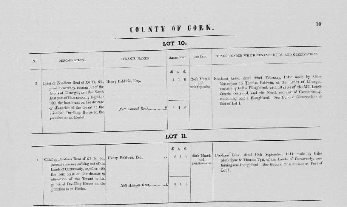 1851 Landed Estate Sale of Roughgrove/Derrygariff, Within Two Miles of Bandon Co.Cork c 400 acres Originating Fee Farm Grant of 1610 Sir Bernard Granville to Giles Maskelyn and Sub Leases 1612-1625, Maps Tenant Listings.