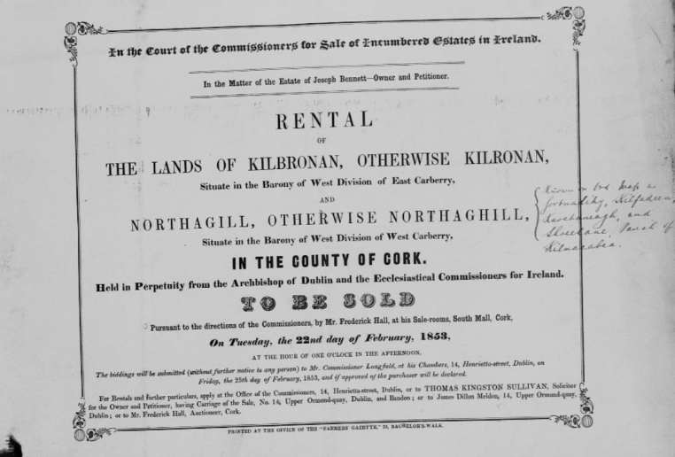 1853, Landed Estates Court Sale of Estate of Joseph Bennett, including Kilbrogan/Kilronan, Dunmanway, Northagill (Gortnadihn, Kilfadean, Knockenagh, Shreelane Parish of Kilmacabea), West Cork, along line of proposed Dunmanway to Drimoleague Railway, Maps, Major Tenant Listing.