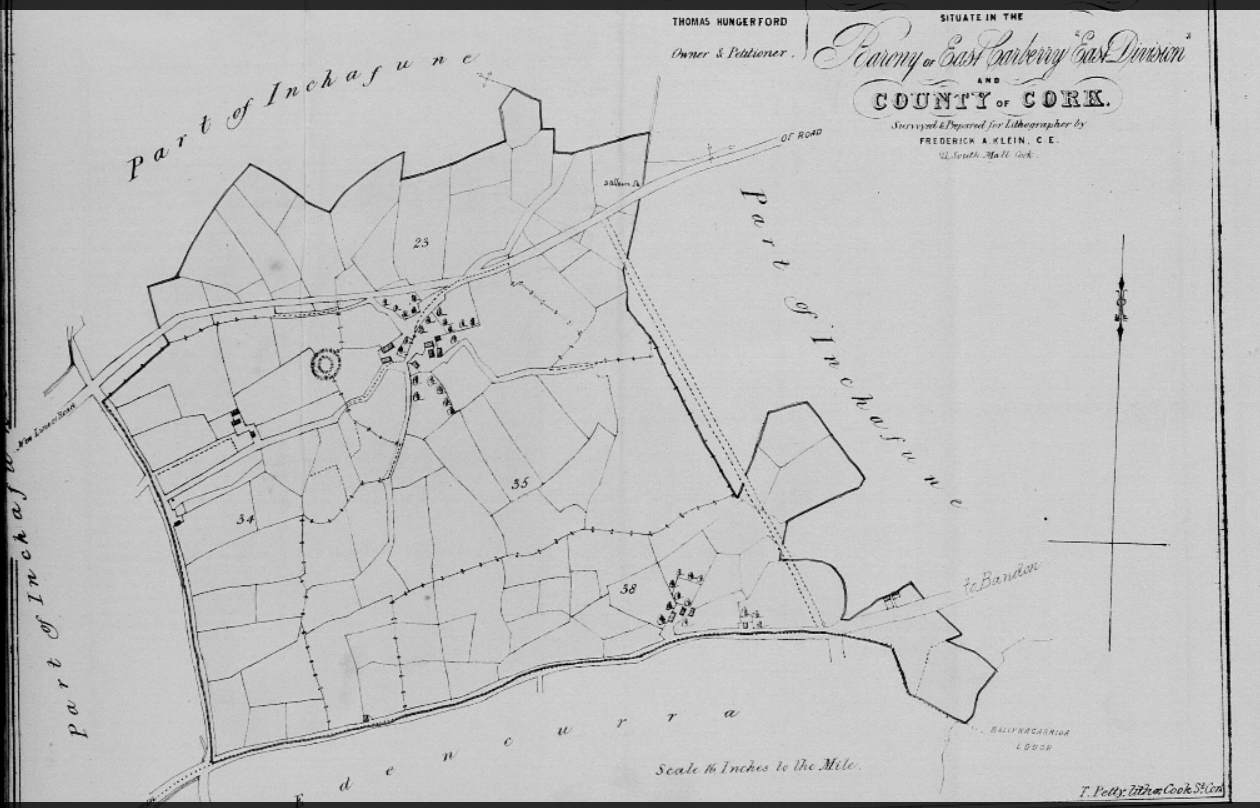 1859. Landed Estates Court Sale of Estate (567 acres) of Thomas Hungerford at Inchafune (Keelnareliga, Gutteeetown,The Commons, Monanearig Bog), East Carbery, 3 Miles East Dunmanway, West Cork, Maps, Among Names, Bryan, Butler, Carroll, Crowley, Cullinan, Donegan, Driscoll, Dullet, Gillman, Holmes, Jagoe, O’Callaghan, McCarthy, Dr. Morrison, Murphy, Santry, Swanton. Possible connection between Judge Robert Swanton, New York and Cork Dunscomb family.