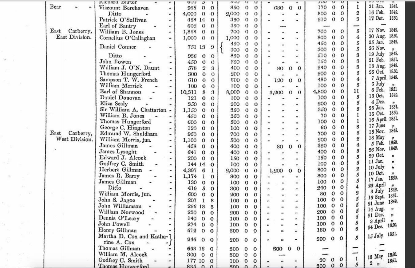 1851. Report of A. N. Neal, Inspector of Drainage on Land Improvement in South West Cork. Larger Farmers Precluded from Applying For Benefit of Land Improvement as They Did Not Possess Sufficient Legal Title under Act. Praise for William Bence Jones (Clonakilty). Rev. R. Wright (Probably Beecher Land Agent), Rev. John Triphook (Mizen Peninsula) Rev. Thomas Tuckey (Probably Drimoleague), Mrs. L. C. Kearney (Garretstown), Mr. John Moloney, William T. Hungerford (Rosscarbery), Henry Baldwin, Cornelius O’Callaghan, Rev. John Murphy (Probably Newtown , Bantry).