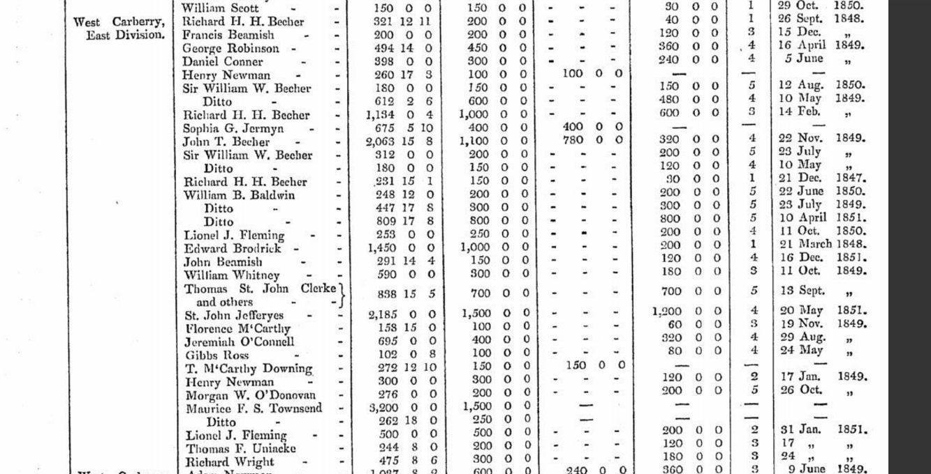 1851. Report of A. N. Neal, Inspector of Drainage on Land Improvement in South West Cork. Larger Farmers Precluded from Applying For Benefit of Land Improvement as They Did Not Possess Sufficient Legal Title under Act. Praise for William Bence Jones (Clonakilty). Rev. R. Wright (Probably Beecher Land Agent), Rev. John Triphook (Mizen Peninsula) Rev. Thomas Tuckey (Probably Drimoleague), Mrs. L. C. Kearney (Garretstown), Mr. John Moloney, William T. Hungerford (Rosscarbery), Henry Baldwin, Cornelius O’Callaghan, Rev. John Murphy (Probably Newtown , Bantry).
