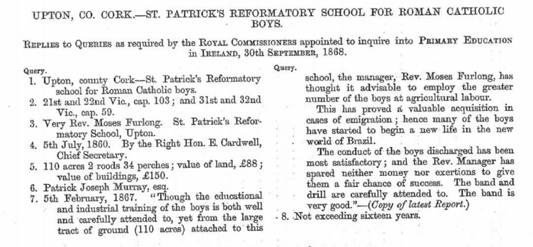 Report on Upton, Innishannon, Co. Cork, Reformatory School for Roman Catholic Boys, Opened 1860 in Former Home of Rev. Somers Payne, Some of The Boys Go to Brazil 24 Monday Oct 2016 Original size at 1185 × 552 ≈ Leave a comment