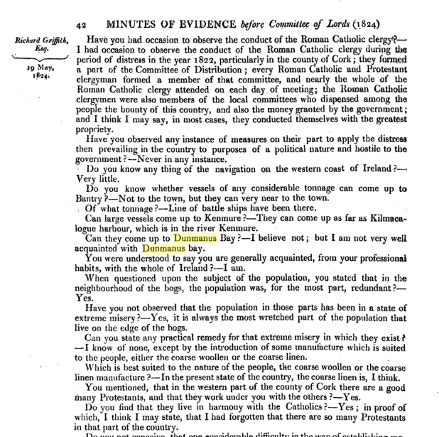 1824, Evidence of Sir Richard Griffith Esq., Road Engineer, to House of Commons Select Committee, on Harmony in West Cork between Protestant and Catholics, Distress of 1822, Only Part of Ireland he Employed Poor Protestants on Road Building, Evidence of Alexander Nimmo, Scots Road Engineer on Building of 19 miles on the Northern Side of Bantry Bay under Joint Supervision of Captain O’Sullivan Most of His Workers are His Tenants Not Paid in Cash but in Rent Abatement. Elsewhere Nimmo’s evidence of Enormous Economic Benefits of Road Building