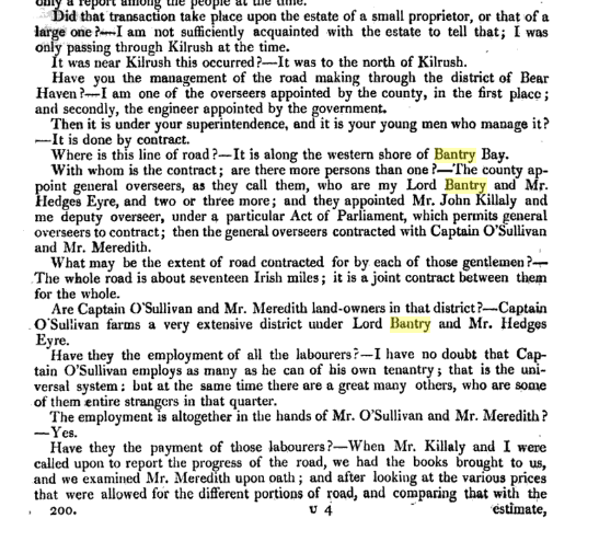 1824, Evidence of Sir Richard Griffith Esq., Road Engineer, to House of Commons Select Committee, on Harmony in West Cork between Protestant and Catholics, Distress of 1822, Only Part of Ireland he Employed Poor Protestants on Road Building, Evidence of Alexander Nimmo, Scots Road Engineer on Building of 19 miles on the Northern Side of Bantry Bay under Joint Supervision of Captain O’Sullivan Most of His Workers are His Tenants Not Paid in Cash but in Rent Abatement. Elsewhere Nimmo’s evidence of Enormous Economic Benefits of Road Building