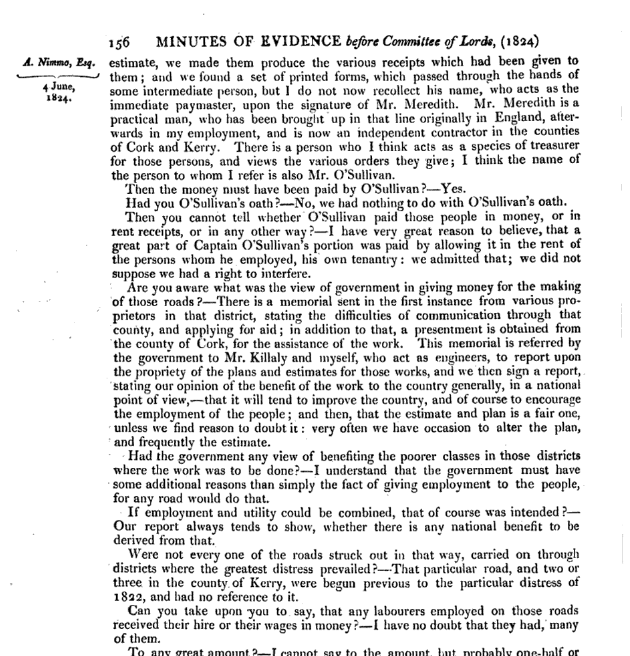 1824, Evidence of Sir Richard Griffith Esq., Road Engineer, to House of Commons Select Committee, on Harmony in West Cork between Protestant and Catholics, Distress of 1822, Only Part of Ireland he Employed Poor Protestants on Road Building, Evidence of Alexander Nimmo, Scots Road Engineer on Building of 19 miles on the Northern Side of Bantry Bay under Joint Supervision of Captain O’Sullivan Most of His Workers are His Tenants Not Paid in Cash but in Rent Abatement. Elsewhere Nimmo’s evidence of Enormous Economic Benefits of Road Building