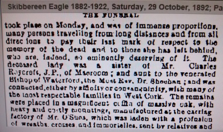 1892. Immense Funeral of Mrs Thomas Dillon, nee Roycroft, Husband Thomas Poor Law Guardian (PLG) Bantry, Obituary a Who’s Who of West Cork. 15 Tuesday Nov 2016 Original size at 2496 × 1479 ≈ Leave a comment