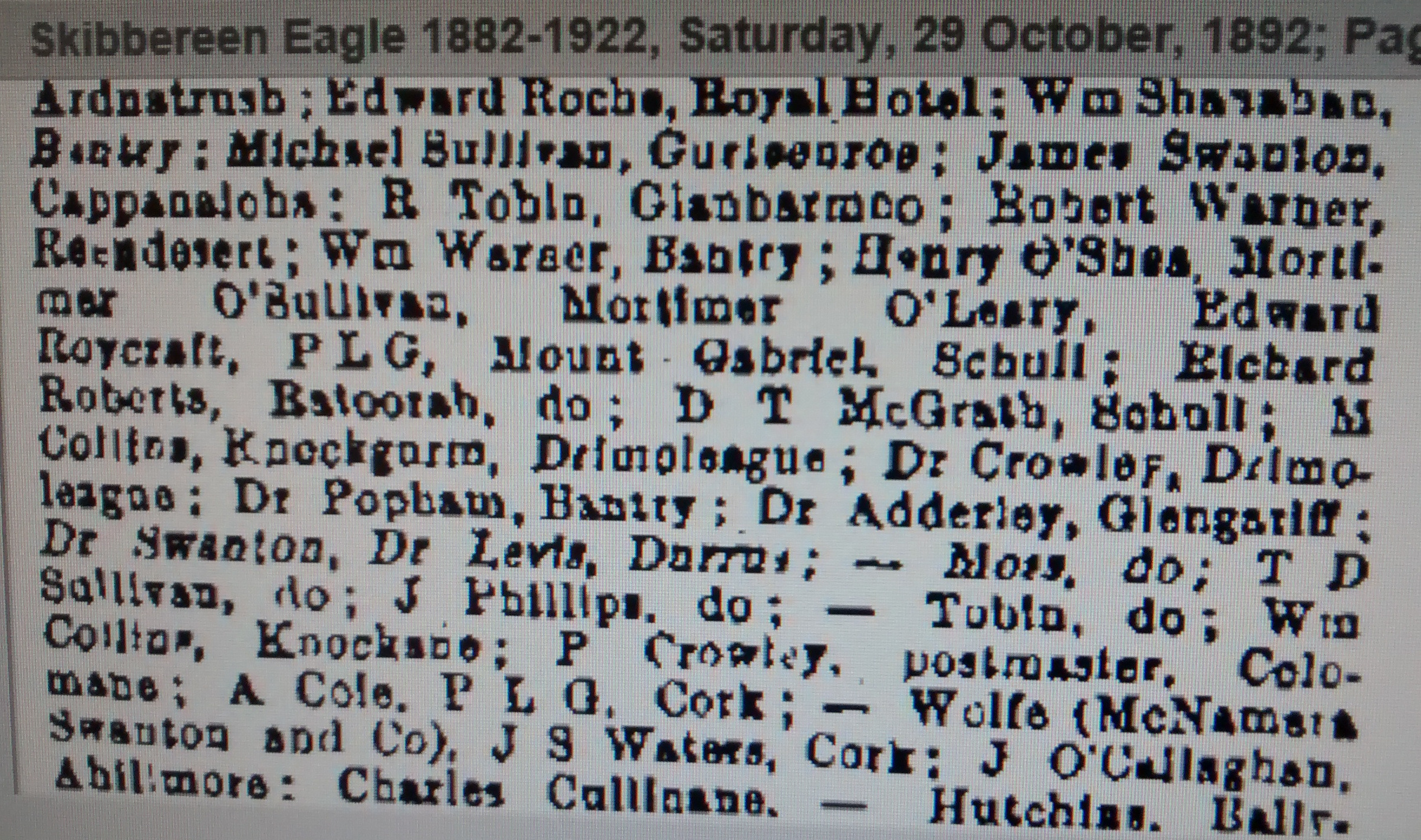 1892. Immense Funeral of Mrs Thomas Dillon, nee Roycroft, Husband Thomas Poor Law Guardian (PLG) Bantry, Obituary a Who’s Who of West Cork. 15 Tuesday Nov 2016 Original size at 2411 × 1426 ≈ Leave a comment