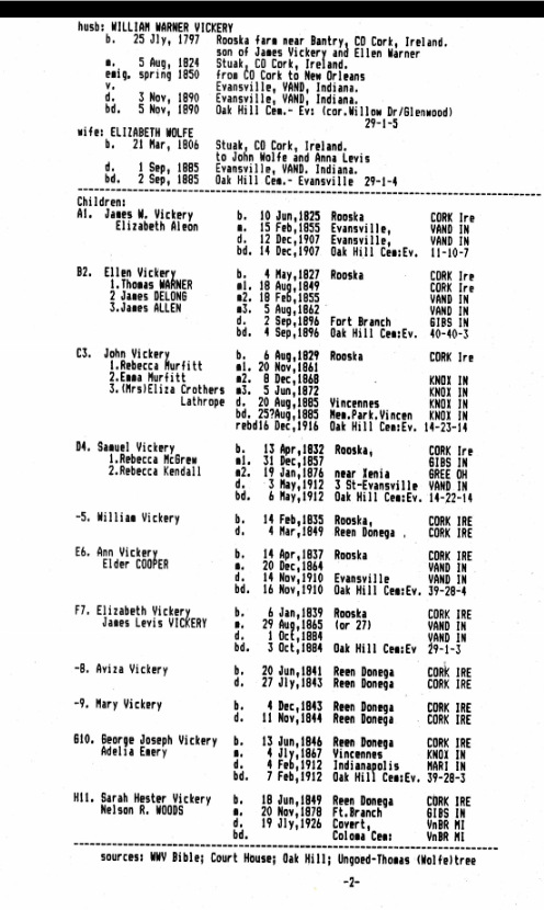 Samuel Vickery (1832-1912) Reminiscences to his Daughter Martha Ellen, Evansville, Indiana, USA, Childhood in Rooska, Parish of Durrus and Reendonegan, Bantry, West Cork, Family Fishery, Girls Hired to Spin Twine for Nets, Catching Sparrows in Thatch of House, Hens Fed Sour Milk and Potatoes, Punished at School at Four Mile Water (Clashadoo, Durrus) For Dipping Spider in Black Ink , Emigration 1850 to New Orleans Upriver to Indiana