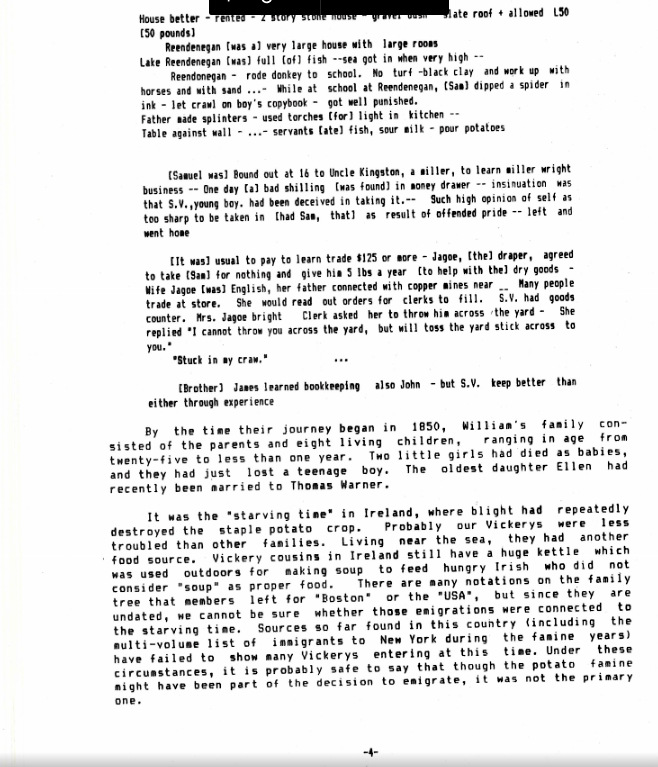 Samuel Vickery (1832-1912) Reminiscences to his Daughter Martha Ellen, Evansville, Indiana, USA, Childhood in Rooska, Parish of Durrus and Reendonegan, Bantry, West Cork, Family Fishery, Girls Hired to Spin Twine for Nets, Catching Sparrows in Thatch of House, Hens Fed Sour Milk and Potatoes, Punished at School at Four Mile Water (Clashadoo, Durrus) For Dipping Spider in Black Ink , Emigration 1850 to New Orleans Upriver to Indiana