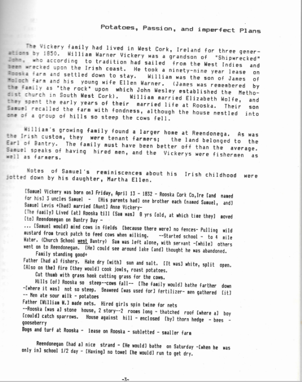 Samuel Vickery (1832-1912) Reminiscences to his Daughter Martha Ellen, Evansville, Indiana, USA, Childhood in Rooska, Parish of Durrus and Reendonegan, Bantry, West Cork, Family Fishery, Girls Hired to Spin Twine for Nets, Catching Sparrows in Thatch of House, Hens Fed Sour Milk and Potatoes, Punished at School at Four Mile Water (Clashadoo, Durrus) For Dipping Spider in Black Ink , Emigration 1850 to New Orleans Upriver to Indiana
