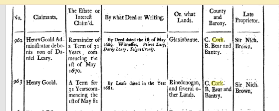1710, List of the CLAIMS as they are ENTERED with the TRUSTEES at CHICHESTER HOUSE on COLLEGE GREEN DUBLIN, for Baronies of West Carbery Bantry and Bere including Baltimore, Sherkin, Clonee, Durrus, Reendonegan, Bantry.