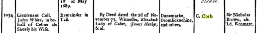 1710, List of the CLAIMS as they are ENTERED with the TRUSTEES at CHICHESTER HOUSE on COLLEGE GREEN DUBLIN, for Baronies of West Carbery Bantry and Bere including Baltimore, Sherkin, Clonee, Durrus, Reendonegan, Bantry.