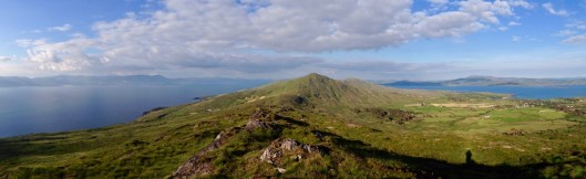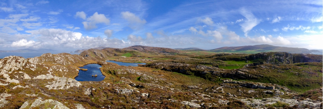 Ireland’s green landscapes presented using the panorama technology of a phone camera! Top – the two lakes at Dunlough, above Three Castle Head, Mizen Peninsula; centre – view across Roaringwater Bay from the top of Mount Gabriel; lower – Peekeen ridge, Sheep’s Head Peninsula