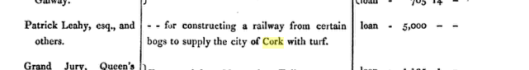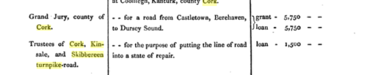 1729 Turnpike Trust. 1822 Cork, Skibbereen and Kinsale Turnpike (Toll Road), Tolled to 1843. 1839 Funding by Commissioner of Public Works, Loan to Trustees of Cork, Skibbereen and Kinsale Turnpike, For road from Castletownbere to Dursey Island, For a Railway From Certain Bogs to Supply Cork with Turf.