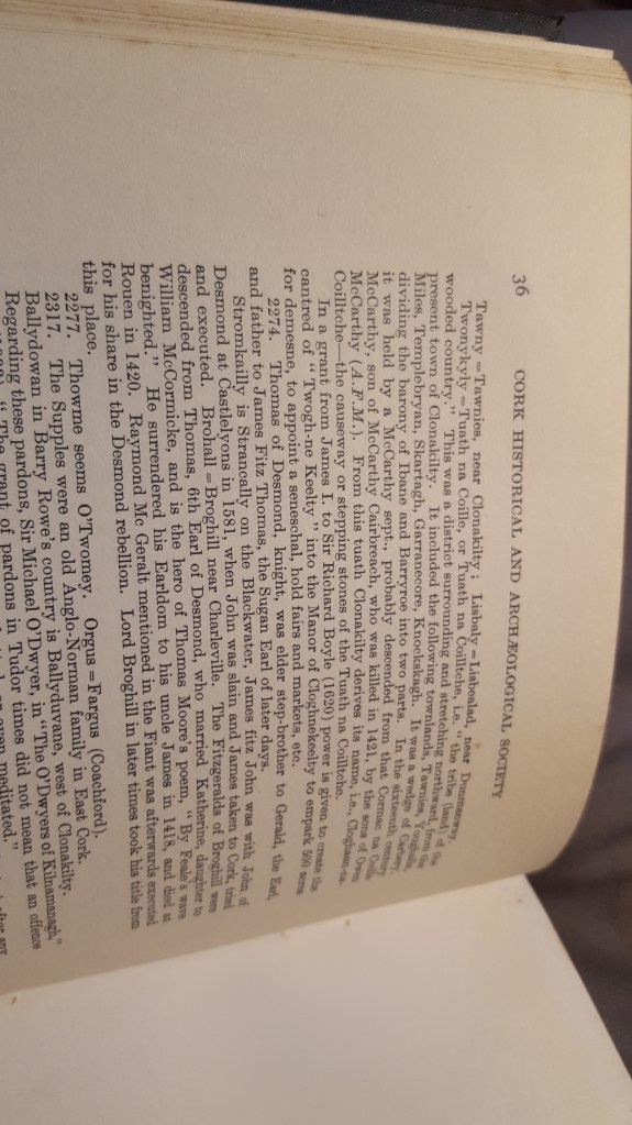 1572 on. Fiants of Queen Elizabeth 1 of England with West Cork References Multiple Pardons (McCarthy/O’Driscolls, Crowleys/O’Crowleys/Dalys/O’Mahonys/O’Cullanes/Collins for ‘Rebels’. Includes Donald Oge McDonnell McCartie, Brahalish Donald Mac Owen McDonogh O’Dailie, Montrewarie (Kilcrohane). 1595-6, multiple O’Mahonys included Bandon and Mizen area, McCarthys, O’Donovans, Crowleys