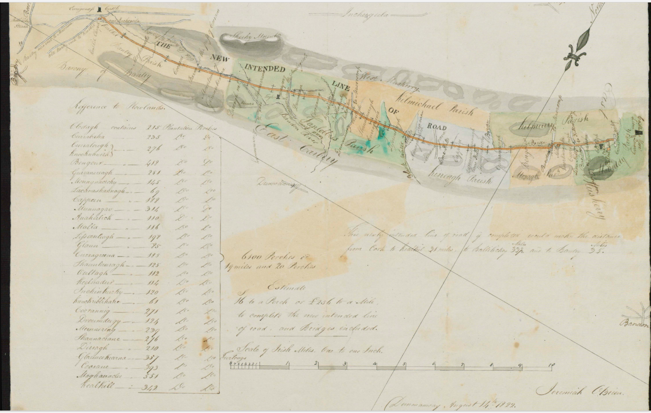 1822, Herbert Gillman, Woodbrook, Dunmanway, County Cork, seeking financial aid for a new line of road leading from Crookstown, in the parish of Moviddy, over the Barna or Pass of Cousane to Kealkil in the parish of Bantry, incorporating Ballilickey, Coosane and other parishes. The Newly Road if Built would Make the Distance from Bantry to Cork 35 Miles. Map by Jeremiah O’Brien shows old Road Bantry/Kealkil, Old Pathway to Bantry over Barna of Cousane, Estimate £256 a mile.