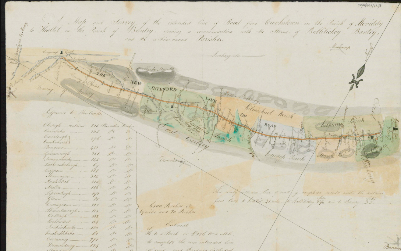 1822, Herbert Gillman, Woodbrook, Dunmanway, County Cork, seeking financial aid for a new line of road leading from Crookstown, in the parish of Moviddy, over the Barna or Pass of Cousane to Kealkil in the parish of Bantry, incorporating Ballilickey, Coosane and other parishes. The Newly Road if Built would Make the Distance from Bantry to Cork 35 Miles. Map by Jeremiah O’Brien shows old Road Bantry/Kealkil, Old Pathway to Bantry over Barna of Cousane, Estimate £256 a mile.