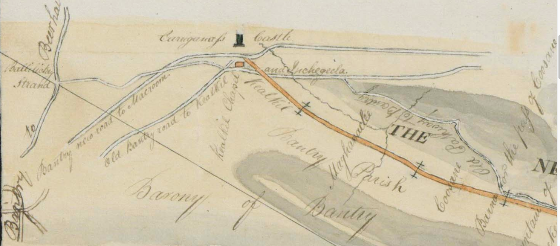 1822, Herbert Gillman, Woodbrook, Dunmanway, County Cork, seeking financial aid for a new line of road leading from Crookstown, in the parish of Moviddy, over the Barna or Pass of Cousane to Kealkil in the parish of Bantry, incorporating Ballilickey, Coosane and other parishes. The Newly Road if Built would Make the Distance from Bantry to Cork 35 Miles. Map by Jeremiah O’Brien shows old Road Bantry/Kealkil, Old Pathway to Bantry over Barna of Cousane, Estimate £256 a mile.