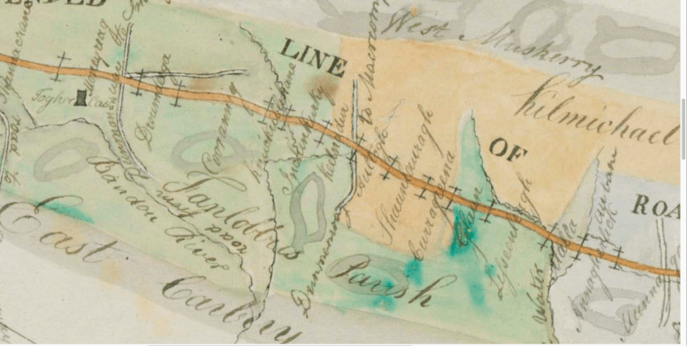 1822, Herbert Gillman, Woodbrook, Dunmanway, County Cork, seeking financial aid for a new line of road leading from Crookstown, in the parish of Moviddy, over the Barna or Pass of Cousane to Kealkil in the parish of Bantry, incorporating Ballilickey, Coosane and other parishes. The Newly Road if Built would Make the Distance from Bantry to Cork 35 Miles. Map by Jeremiah O’Brien shows old Road Bantry/Kealkil, Old Pathway to Bantry over Barna of Cousane, Estimate £256 a mile.