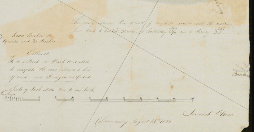 1822, Herbert Gillman, Woodbrook, Dunmanway, County Cork, seeking financial aid for a new line of road leading from Crookstown, in the parish of Moviddy, over the Barna or Pass of Cousane to Kealkil in the parish of Bantry, incorporating Ballilickey, Coosane and other parishes. The Newly Road if Built would Make the Distance from Bantry to Cork 35 Miles. Map by Jeremiah O’Brien shows old Road Bantry/Kealkil, Old Pathway to Bantry over Barna of Cousane, Estimate £256 a mile.