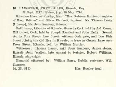 Wills, 1615, William Hill, Bristol/Cork other Hills Bandon, 1616 Richard Dowe, Carrigrohane, 1619, Philip Perry, Bandon, 1624, Barbara Neale, Kinsale, 1635, William Wiseman, Bandon, Edward Turner, Ballygoban (Bantry), 1642, John Draper, Ballymodan, Bandon, 1642, Edward Watkins, Bandon, 1651, Thomas Adderly, Innishannon, 1652, Hugh Pecival, Kinsale, 1673, Ralph Fenwick lands at Carbery, 1676 William Roycroft, Bandon, 1708, Tomas Becher, Sherkin, 1709 John Coughlan Bandon, 1712, Theophilus Lankford, Kinsale, 1715, Rev. Thomas Holmes, Dromfinchin, Bantry, 1718 Anthony Butler (Witness George Wood, Caheragh), probably Drimoleague area, 1719 Cornelius Conner, Bandon, 1722 Roger Houghton, Kinsale, 1724 David Meade, Kinsale, 1726, 1728 Christopher Dowden, Bandon, William Hull, Lemcon, Schull, 1737 Daniel Conner, Bandon, 1738 Henry Jones, Drounbeg, East Carbery, 1739, Jonathan Tanner, Bandon, 1743, 1743, Henry Baldwin, Mossgrove, John Fair, Kinsale, 1765, Edward Herrick, Shippool, 1775 James Chaney, Barryroe. 1778 Lord Baron James Tracton, Kinsale. 1779, Joseph Dowden, Bandon, 1782, Mrs. Jane Busteed, Bandon, 1786, Samuel Jervois, Cork. 1789, David Mellefont, Grafton St., Dublin (Mellefonts appear in Convert Rolls, Donemark, Bantry and Dunmanway), 1799 Morgan Deasy, Doctor of Physic, Clonakilty, 1801 Richard Roycroft, Clonee, Durrus