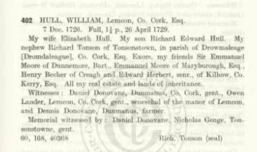 Wills, 1615, William Hill, Bristol/Cork other Hills Bandon, 1616 Richard Dowe, Carrigrohane, 1619, Philip Perry, Bandon, 1624, Barbara Neale, Kinsale, 1635, William Wiseman, Bandon, Edward Turner, Ballygoban (Bantry), 1642, John Draper, Ballymodan, Bandon, 1642, Edward Watkins, Bandon, 1651, Thomas Adderly, Innishannon, 1652, Hugh Pecival, Kinsale, 1673, Ralph Fenwick lands at Carbery, 1676 William Roycroft, Bandon, 1708, Tomas Becher, Sherkin, 1709 John Coughlan Bandon, 1712, Theophilus Lankford, Kinsale, 1715, Rev. Thomas Holmes, Dromfinchin, Bantry, 1718 Anthony Butler (Witness George Wood, Caheragh), probably Drimoleague area, 1719 Cornelius Conner, Bandon, 1722 Roger Houghton, Kinsale, 1724 David Meade, Kinsale, 1726, 1728 Christopher Dowden, Bandon, William Hull, Lemcon, Schull, 1737 Daniel Conner, Bandon, 1738 Henry Jones, Drounbeg, East Carbery, 1739, Jonathan Tanner, Bandon, 1743, 1743, Henry Baldwin, Mossgrove, John Fair, Kinsale, 1765, Edward Herrick, Shippool, 1775 James Chaney, Barryroe. 1778 Lord Baron James Tracton, Kinsale. 1779, Joseph Dowden, Bandon, 1782, Mrs. Jane Busteed, Bandon, 1786, Samuel Jervois, Cork. 1789, David Mellefont, Grafton St., Dublin (Mellefonts appear in Convert Rolls, Donemark, Bantry and Dunmanway), 1799 Morgan Deasy, Doctor of Physic, Clonakilty, 1801 Richard Roycroft, Clonee, Durrus