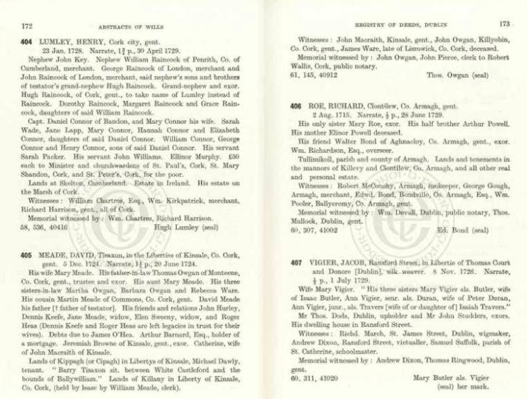 Wills, 1615, William Hill, Bristol/Cork other Hills Bandon, 1616 Richard Dowe, Carrigrohane, 1619, Philip Perry, Bandon, 1624, Barbara Neale, Kinsale, 1635, William Wiseman, Bandon, Edward Turner, Ballygoban (Bantry), 1642, John Draper, Ballymodan, Bandon, 1642, Edward Watkins, Bandon, 1651, Thomas Adderly, Innishannon, 1652, Hugh Pecival, Kinsale, 1673, Ralph Fenwick lands at Carbery, 1676 William Roycroft, Bandon, 1708, Tomas Becher, Sherkin, 1709 John Coughlan Bandon, 1712, Theophilus Lankford, Kinsale, 1715, Rev. Thomas Holmes, Dromfinchin, Bantry, 1718 Anthony Butler (Witness George Wood, Caheragh), probably Drimoleague area, 1719 Cornelius Conner, Bandon, 1722 Roger Houghton, Kinsale, 1724 David Meade, Kinsale, 1726, 1728 Christopher Dowden, Bandon, William Hull, Lemcon, Schull, 1737 Daniel Conner, Bandon, 1738 Henry Jones, Drounbeg, East Carbery, 1739, Jonathan Tanner, Bandon, 1743, 1743, Henry Baldwin, Mossgrove, John Fair, Kinsale, 1765, Edward Herrick, Shippool, 1775 James Chaney, Barryroe. 1778 Lord Baron James Tracton, Kinsale. 1779, Joseph Dowden, Bandon, 1782, Mrs. Jane Busteed, Bandon, 1786, Samuel Jervois, Cork. 1789, David Mellefont, Grafton St., Dublin (Mellefonts appear in Convert Rolls, Donemark, Bantry and Dunmanway), 1799 Morgan Deasy, Doctor of Physic, Clonakilty, 1801 Richard Roycroft, Clonee, Durrus