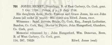Wills, 1615, William Hill, Bristol/Cork other Hills Bandon, 1616 Richard Dowe, Carrigrohane, 1619, Philip Perry, Bandon, 1624, Barbara Neale, Kinsale, 1635, William Wiseman, Bandon, Edward Turner, Ballygoban (Bantry), 1642, John Draper, Ballymodan, Bandon, 1642, Edward Watkins, Bandon, 1651, Thomas Adderly, Innishannon, 1652, Hugh Pecival, Kinsale, 1673, Ralph Fenwick lands at Carbery, 1676 William Roycroft, Bandon, 1708, Tomas Becher, Sherkin, 1709 John Coughlan Bandon, 1712, Theophilus Lankford, Kinsale, 1715, Rev. Thomas Holmes, Dromfinchin, Bantry, 1718 Anthony Butler (Witness George Wood, Caheragh), probably Drimoleague area, 1719 Cornelius Conner, Bandon, 1722 Roger Houghton, Kinsale, 1724 David Meade, Kinsale, 1726, 1728 Christopher Dowden, Bandon, William Hull, Lemcon, Schull, 1737 Daniel Conner, Bandon, 1738 Henry Jones, Drounbeg, East Carbery, 1739, Jonathan Tanner, Bandon, 1743, 1743, Henry Baldwin, Mossgrove, John Fair, Kinsale, 1765, Edward Herrick, Shippool, 1775 James Chaney, Barryroe. 1778 Lord Baron James Tracton, Kinsale. 1779, Joseph Dowden, Bandon, 1782, Mrs. Jane Busteed, Bandon, 1786, Samuel Jervois, Cork. 1789, David Mellefont, Grafton St., Dublin (Mellefonts appear in Convert Rolls, Donemark, Bantry and Dunmanway), 1799 Morgan Deasy, Doctor of Physic, Clonakilty, 1801 Richard Roycroft, Clonee, Durrus