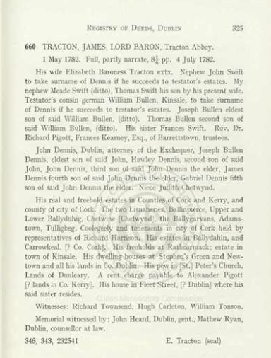 Wills, 1615, William Hill, Bristol/Cork other Hills Bandon, 1616 Richard Dowe, Carrigrohane, 1619, Philip Perry, Bandon, 1624, Barbara Neale, Kinsale, 1635, William Wiseman, Bandon, Edward Turner, Ballygoban (Bantry), 1642, John Draper, Ballymodan, Bandon, 1642, Edward Watkins, Bandon, 1651, Thomas Adderly, Innishannon, 1652, Hugh Pecival, Kinsale, 1673, Ralph Fenwick lands at Carbery, 1676 William Roycroft, Bandon, 1708, Tomas Becher, Sherkin, 1709 John Coughlan Bandon, 1712, Theophilus Lankford, Kinsale, 1715, Rev. Thomas Holmes, Dromfinchin, Bantry, 1718 Anthony Butler (Witness George Wood, Caheragh), probably Drimoleague area, 1719 Cornelius Conner, Bandon, 1722 Roger Houghton, Kinsale, 1724 David Meade, Kinsale, 1726, 1728 Christopher Dowden, Bandon, William Hull, Lemcon, Schull, 1737 Daniel Conner, Bandon, 1738 Henry Jones, Drounbeg, East Carbery, 1739, Jonathan Tanner, Bandon, 1743, 1743, Henry Baldwin, Mossgrove, John Fair, Kinsale, 1765, Edward Herrick, Shippool, 1775 James Chaney, Barryroe. 1778 Lord Baron James Tracton, Kinsale. 1779, Joseph Dowden, Bandon, 1782, Mrs. Jane Busteed, Bandon, 1786, Samuel Jervois, Cork. 1789, David Mellefont, Grafton St., Dublin (Mellefonts appear in Convert Rolls, Donemark, Bantry and Dunmanway), 1799 Morgan Deasy, Doctor of Physic, Clonakilty, 1801 Richard Roycroft, Clonee, Durrus