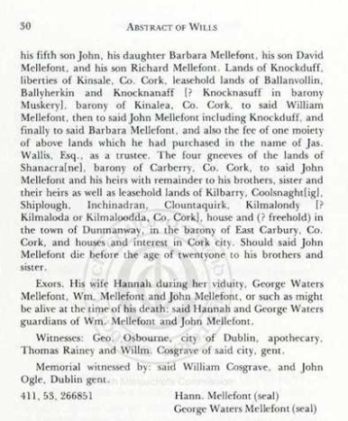 Wills, 1615, William Hill, Bristol/Cork other Hills Bandon, 1616 Richard Dowe, Carrigrohane, 1619, Philip Perry, Bandon, 1624, Barbara Neale, Kinsale, 1635, William Wiseman, Bandon, Edward Turner, Ballygoban (Bantry), 1642, John Draper, Ballymodan, Bandon, 1642, Edward Watkins, Bandon, 1651, Thomas Adderly, Innishannon, 1652, Hugh Pecival, Kinsale, 1673, Ralph Fenwick lands at Carbery, 1676 William Roycroft, Bandon, 1708, Tomas Becher, Sherkin, 1709 John Coughlan Bandon, 1712, Theophilus Lankford, Kinsale, 1715, Rev. Thomas Holmes, Dromfinchin, Bantry, 1718 Anthony Butler (Witness George Wood, Caheragh), probably Drimoleague area, 1719 Cornelius Conner, Bandon, 1722 Roger Houghton, Kinsale, 1724 David Meade, Kinsale, 1726, 1728 Christopher Dowden, Bandon, William Hull, Lemcon, Schull, 1737 Daniel Conner, Bandon, 1738 Henry Jones, Drounbeg, East Carbery, 1739, Jonathan Tanner, Bandon, 1743, 1743, Henry Baldwin, Mossgrove, John Fair, Kinsale, 1765, Edward Herrick, Shippool, 1775 James Chaney, Barryroe. 1778 Lord Baron James Tracton, Kinsale. 1779, Joseph Dowden, Bandon, 1782, Mrs. Jane Busteed, Bandon, 1786, Samuel Jervois, Cork. 1789, David Mellefont, Grafton St., Dublin (Mellefonts appear in Convert Rolls, Donemark, Bantry and Dunmanway), 1799 Morgan Deasy, Doctor of Physic, Clonakilty, 1801 Richard Roycroft, Clonee, Durrus