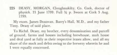 Wills, 1615, William Hill, Bristol/Cork other Hills Bandon, 1616 Richard Dowe, Carrigrohane, 1619, Philip Perry, Bandon, 1624, Barbara Neale, Kinsale, 1635, William Wiseman, Bandon, Edward Turner, Ballygoban (Bantry), 1642, John Draper, Ballymodan, Bandon, 1642, Edward Watkins, Bandon, 1651, Thomas Adderly, Innishannon, 1652, Hugh Pecival, Kinsale, 1673, Ralph Fenwick lands at Carbery, 1676 William Roycroft, Bandon, 1708, Tomas Becher, Sherkin, 1709 John Coughlan Bandon, 1712, Theophilus Lankford, Kinsale, 1715, Rev. Thomas Holmes, Dromfinchin, Bantry, 1718 Anthony Butler (Witness George Wood, Caheragh), probably Drimoleague area, 1719 Cornelius Conner, Bandon, 1722 Roger Houghton, Kinsale, 1724 David Meade, Kinsale, 1726, 1728 Christopher Dowden, Bandon, William Hull, Lemcon, Schull, 1737 Daniel Conner, Bandon, 1738 Henry Jones, Drounbeg, East Carbery, 1739, Jonathan Tanner, Bandon, 1743, 1743, Henry Baldwin, Mossgrove, John Fair, Kinsale, 1765, Edward Herrick, Shippool, 1775 James Chaney, Barryroe. 1778 Lord Baron James Tracton, Kinsale. 1779, Joseph Dowden, Bandon, 1782, Mrs. Jane Busteed, Bandon, 1786, Samuel Jervois, Cork. 1789, David Mellefont, Grafton St., Dublin (Mellefonts appear in Convert Rolls, Donemark, Bantry and Dunmanway), 1799 Morgan Deasy, Doctor of Physic, Clonakilty, 1801 Richard Roycroft, Clonee, Durrus