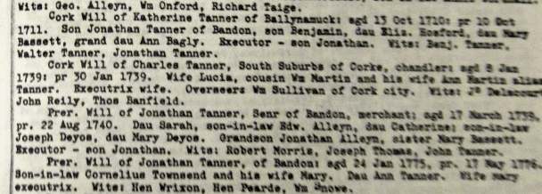 Wills, 1615, William Hill, Bristol/Cork other Hills Bandon, 1616 Richard Dowe, Carrigrohane, 1619, Philip Perry, Bandon, 1624, Barbara Neale, Kinsale, 1635, William Wiseman, Bandon, Edward Turner, Ballygoban (Bantry), 1642, John Draper, Ballymodan, Bandon, 1642, Edward Watkins, Bandon, 1651, Thomas Adderly, Innishannon, 1652, Hugh Pecival, Kinsale, 1673, Ralph Fenwick lands at Carbery, 1676 William Roycroft, Bandon, 1708, Tomas Becher, Sherkin, 1709 John Coughlan Bandon, 1712, Theophilus Lankford, Kinsale, 1715, Rev. Thomas Holmes, Dromfinchin, Bantry, 1718 Anthony Butler (Witness George Wood, Caheragh), probably Drimoleague area, 1719 Cornelius Conner, Bandon, 1722 Roger Houghton, Kinsale, 1724 David Meade, Kinsale, 1726, 1728 Christopher Dowden, Bandon, William Hull, Lemcon, Schull, 1737 Daniel Conner, Bandon, 1738 Henry Jones, Drounbeg, East Carbery, 1739, Jonathan Tanner, Bandon, 1743, 1743, Henry Baldwin, Mossgrove, John Fair, Kinsale, 1765, Edward Herrick, Shippool, 1775 James Chaney, Barryroe. 1778 Lord Baron James Tracton, Kinsale. 1779, Joseph Dowden, Bandon, 1782, Mrs. Jane Busteed, Bandon, 1786, Samuel Jervois, Cork. 1789, David Mellefont, Grafton St., Dublin (Mellefonts appear in Convert Rolls, Donemark, Bantry and Dunmanway), 1799 Morgan Deasy, Doctor of Physic, Clonakilty, 1801 Richard Roycroft, Clonee, Durrus