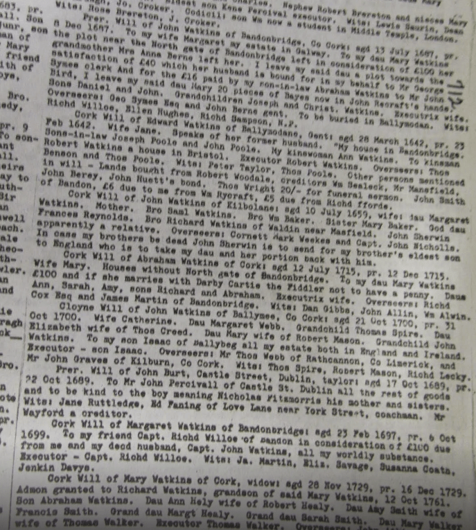 Wills, 1615, William Hill, Bristol/Cork other Hills Bandon, 1616 Richard Dowe, Carrigrohane, 1619, Philip Perry, Bandon, 1624, Barbara Neale, Kinsale, 1635, William Wiseman, Bandon, Edward Turner, Ballygoban (Bantry), 1642, John Draper, Ballymodan, Bandon, 1642, Edward Watkins, Bandon, 1651, Thomas Adderly, Innishannon, 1652, Hugh Pecival, Kinsale, 1673, Ralph Fenwick lands at Carbery, 1676 William Roycroft, Bandon, 1708, Tomas Becher, Sherkin, 1709 John Coughlan Bandon, 1712, Theophilus Lankford, Kinsale, 1715, Rev. Thomas Holmes, Dromfinchin, Bantry, 1718 Anthony Butler (Witness George Wood, Caheragh), probably Drimoleague area, 1719 Cornelius Conner, Bandon, 1722 Roger Houghton, Kinsale, 1724 David Meade, Kinsale, 1726, 1728 Christopher Dowden, Bandon, William Hull, Lemcon, Schull, 1737 Daniel Conner, Bandon, 1738 Henry Jones, Drounbeg, East Carbery, 1739, Jonathan Tanner, Bandon, 1743, 1743, Henry Baldwin, Mossgrove, John Fair, Kinsale, 1765, Edward Herrick, Shippool, 1775 James Chaney, Barryroe. 1778 Lord Baron James Tracton, Kinsale. 1779, Joseph Dowden, Bandon, 1782, Mrs. Jane Busteed, Bandon, 1786, Samuel Jervois, Cork. 1789, David Mellefont, Grafton St., Dublin (Mellefonts appear in Convert Rolls, Donemark, Bantry and Dunmanway), 1799 Morgan Deasy, Doctor of Physic, Clonakilty, 1801 Richard Roycroft, Clonee, Durrus