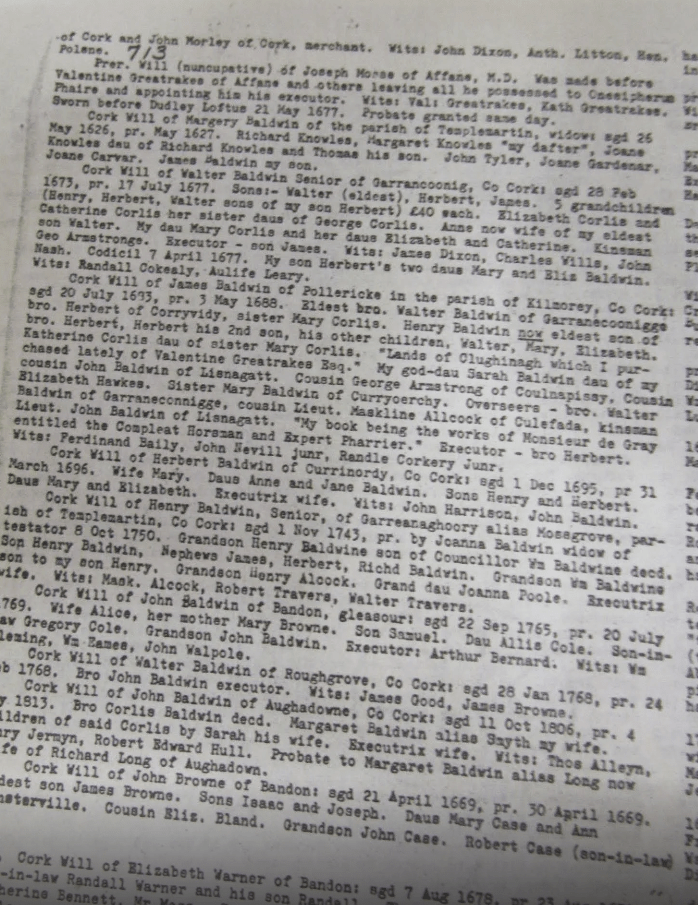 Wills, 1615, William Hill, Bristol/Cork other Hills Bandon, 1616 Richard Dowe, Carrigrohane, 1619, Philip Perry, Bandon, 1624, Barbara Neale, Kinsale, 1635, William Wiseman, Bandon, Edward Turner, Ballygoban (Bantry), 1642, John Draper, Ballymodan, Bandon, 1642, Edward Watkins, Bandon, 1651, Thomas Adderly, Innishannon, 1652, Hugh Pecival, Kinsale, 1673, Ralph Fenwick lands at Carbery, 1676 William Roycroft, Bandon, 1708, Tomas Becher, Sherkin, 1709 John Coughlan Bandon, 1712, Theophilus Lankford, Kinsale, 1715, Rev. Thomas Holmes, Dromfinchin, Bantry, 1718 Anthony Butler (Witness George Wood, Caheragh), probably Drimoleague area, 1719 Cornelius Conner, Bandon, 1722 Roger Houghton, Kinsale, 1724 David Meade, Kinsale, 1726, 1728 Christopher Dowden, Bandon, William Hull, Lemcon, Schull, 1737 Daniel Conner, Bandon, 1738 Henry Jones, Drounbeg, East Carbery, 1739, Jonathan Tanner, Bandon, 1743, 1743, Henry Baldwin, Mossgrove, John Fair, Kinsale, 1765, Edward Herrick, Shippool, 1775 James Chaney, Barryroe. 1778 Lord Baron James Tracton, Kinsale. 1779, Joseph Dowden, Bandon, 1782, Mrs. Jane Busteed, Bandon, 1786, Samuel Jervois, Cork. 1789, David Mellefont, Grafton St., Dublin (Mellefonts appear in Convert Rolls, Donemark, Bantry and Dunmanway), 1799 Morgan Deasy, Doctor of Physic, Clonakilty, 1801 Richard Roycroft, Clonee, Durrus