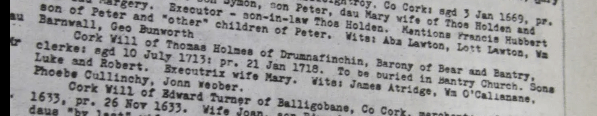 Wills, 1615, William Hill, Bristol/Cork other Hills Bandon, 1616 Richard Dowe, Carrigrohane, 1619, Philip Perry, Bandon, 1624, Barbara Neale, Kinsale, 1635, William Wiseman, Bandon, Edward Turner, Ballygoban (Bantry), 1642, John Draper, Ballymodan, Bandon, 1642, Edward Watkins, Bandon, 1651, Thomas Adderly, Innishannon, 1652, Hugh Pecival, Kinsale, 1673, Ralph Fenwick lands at Carbery, 1676 William Roycroft, Bandon, 1708, Tomas Becher, Sherkin, 1709 John Coughlan Bandon, 1712, Theophilus Lankford, Kinsale, 1715, Rev. Thomas Holmes, Dromfinchin, Bantry, 1718 Anthony Butler (Witness George Wood, Caheragh), probably Drimoleague area, 1719 Cornelius Conner, Bandon, 1722 Roger Houghton, Kinsale, 1724 David Meade, Kinsale, 1726, 1728 Christopher Dowden, Bandon, William Hull, Lemcon, Schull, 1737 Daniel Conner, Bandon, 1738 Henry Jones, Drounbeg, East Carbery, 1739, Jonathan Tanner, Bandon, 1743, 1743, Henry Baldwin, Mossgrove, John Fair, Kinsale, 1765, Edward Herrick, Shippool, 1775 James Chaney, Barryroe. 1778 Lord Baron James Tracton, Kinsale. 1779, Joseph Dowden, Bandon, 1782, Mrs. Jane Busteed, Bandon, 1786, Samuel Jervois, Cork. 1789, David Mellefont, Grafton St., Dublin (Mellefonts appear in Convert Rolls, Donemark, Bantry and Dunmanway), 1799 Morgan Deasy, Doctor of Physic, Clonakilty, 1801 Richard Roycroft, Clonee, Durrus