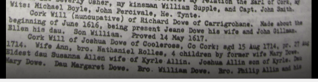 Wills, 1615, William Hill, Bristol/Cork other Hills Bandon, 1616 Richard Dowe, Carrigrohane, 1619, Philip Perry, Bandon, 1624, Barbara Neale, Kinsale, 1635, William Wiseman, Bandon, Edward Turner, Ballygoban (Bantry), 1642, John Draper, Ballymodan, Bandon, 1642, Edward Watkins, Bandon, 1651, Thomas Adderly, Innishannon, 1652, Hugh Pecival, Kinsale, 1673, Ralph Fenwick lands at Carbery, 1676 William Roycroft, Bandon, 1708, Tomas Becher, Sherkin, 1709 John Coughlan Bandon, 1712, Theophilus Lankford, Kinsale, 1715, Rev. Thomas Holmes, Dromfinchin, Bantry, 1718 Anthony Butler (Witness George Wood, Caheragh), probably Drimoleague area, 1719 Cornelius Conner, Bandon, 1722 Roger Houghton, Kinsale, 1724 David Meade, Kinsale, 1726, 1728 Christopher Dowden, Bandon, William Hull, Lemcon, Schull, 1737 Daniel Conner, Bandon, 1738 Henry Jones, Drounbeg, East Carbery, 1739, Jonathan Tanner, Bandon, 1743, 1743, Henry Baldwin, Mossgrove, John Fair, Kinsale, 1765, Edward Herrick, Shippool, 1775 James Chaney, Barryroe. 1778 Lord Baron James Tracton, Kinsale. 1779, Joseph Dowden, Bandon, 1782, Mrs. Jane Busteed, Bandon, 1786, Samuel Jervois, Cork. 1789, David Mellefont, Grafton St., Dublin (Mellefonts appear in Convert Rolls, Donemark, Bantry and Dunmanway), 1799 Morgan Deasy, Doctor of Physic, Clonakilty, 1801 Richard Roycroft, Clonee, Durrus