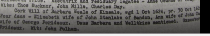Wills, 1615, William Hill, Bristol/Cork other Hills Bandon, 1616 Richard Dowe, Carrigrohane, 1619, Philip Perry, Bandon, 1624, Barbara Neale, Kinsale, 1635, William Wiseman, Bandon, Edward Turner, Ballygoban (Bantry), 1642, John Draper, Ballymodan, Bandon, 1642, Edward Watkins, Bandon, 1651, Thomas Adderly, Innishannon, 1652, Hugh Pecival, Kinsale, 1673, Ralph Fenwick lands at Carbery, 1676 William Roycroft, Bandon, 1708, Tomas Becher, Sherkin, 1709 John Coughlan Bandon, 1712, Theophilus Lankford, Kinsale, 1715, Rev. Thomas Holmes, Dromfinchin, Bantry, 1718 Anthony Butler (Witness George Wood, Caheragh), probably Drimoleague area, 1719 Cornelius Conner, Bandon, 1722 Roger Houghton, Kinsale, 1724 David Meade, Kinsale, 1726, 1728 Christopher Dowden, Bandon, William Hull, Lemcon, Schull, 1737 Daniel Conner, Bandon, 1738 Henry Jones, Drounbeg, East Carbery, 1739, Jonathan Tanner, Bandon, 1743, 1743, Henry Baldwin, Mossgrove, John Fair, Kinsale, 1765, Edward Herrick, Shippool, 1775 James Chaney, Barryroe. 1778 Lord Baron James Tracton, Kinsale. 1779, Joseph Dowden, Bandon, 1782, Mrs. Jane Busteed, Bandon, 1786, Samuel Jervois, Cork. 1789, David Mellefont, Grafton St., Dublin (Mellefonts appear in Convert Rolls, Donemark, Bantry and Dunmanway), 1799 Morgan Deasy, Doctor of Physic, Clonakilty, 1801 Richard Roycroft, Clonee, Durrus