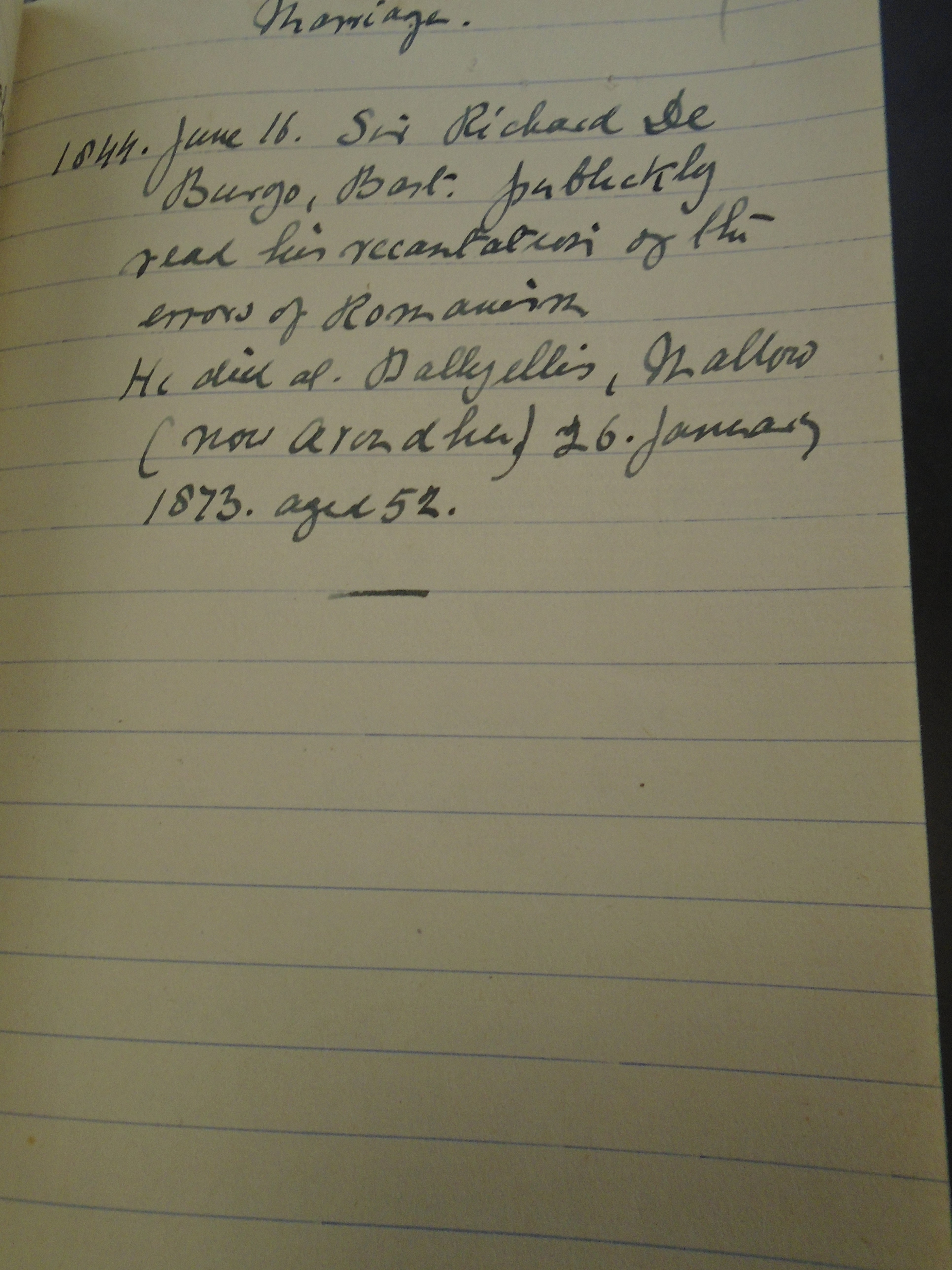 1729. Daniel O’Donovan, (The O’Donovan) Bawnlahan, Leap, Skibbereen, Renounced Popery. Late 1844 Sir Richard de Burgo. Recanted at Castletownroche probably in connection with marriage.