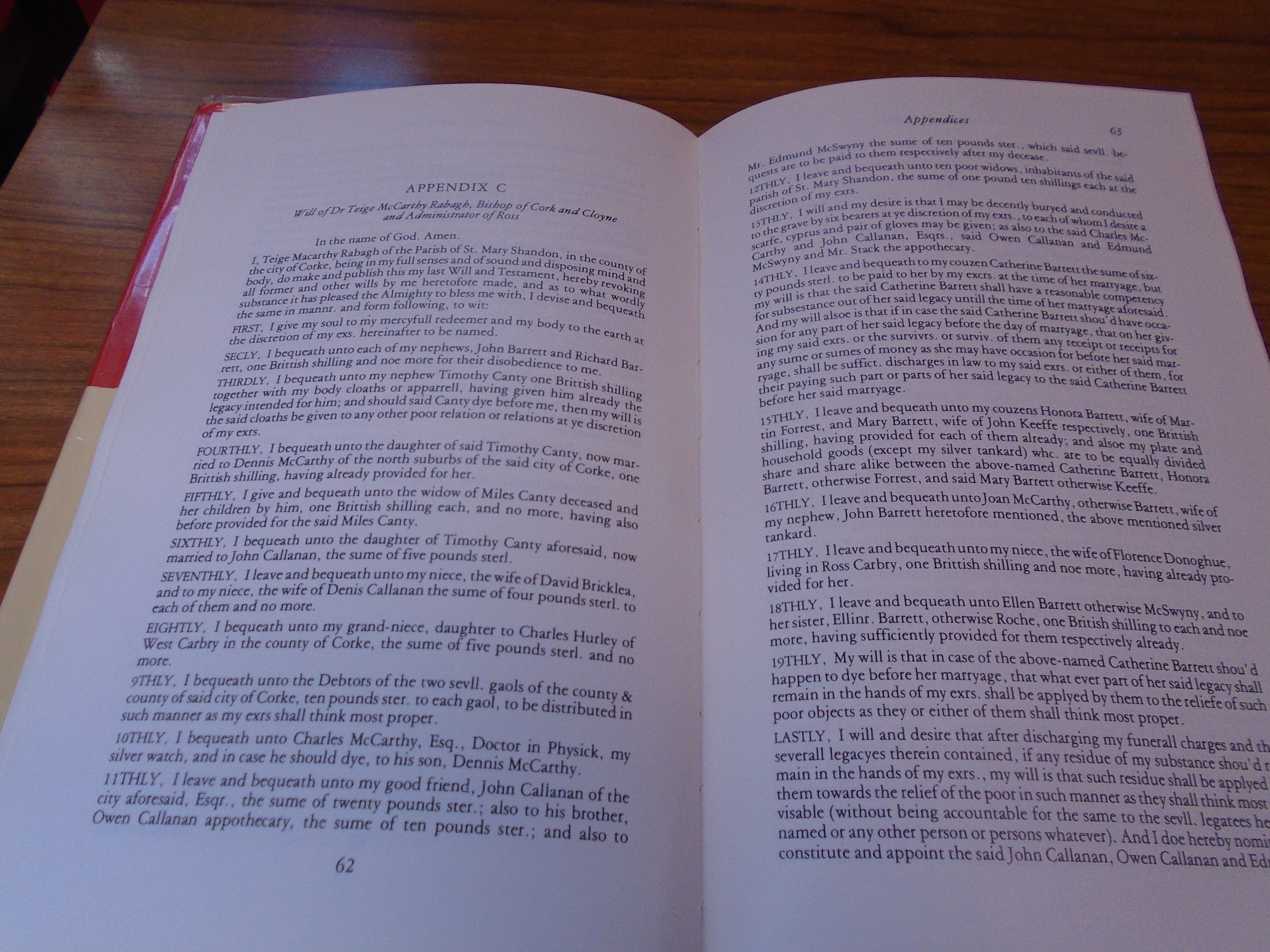 Will Dr. Teige McCarthy Rabach, (1664-1747), Callanan (Hereditary Physicians to McCarthy Reaghs) Relations, J.J. Callanan Poet, To My Nephews John and Richard Barrett, One British Shilling and No More for Their Disobedience to Me.
