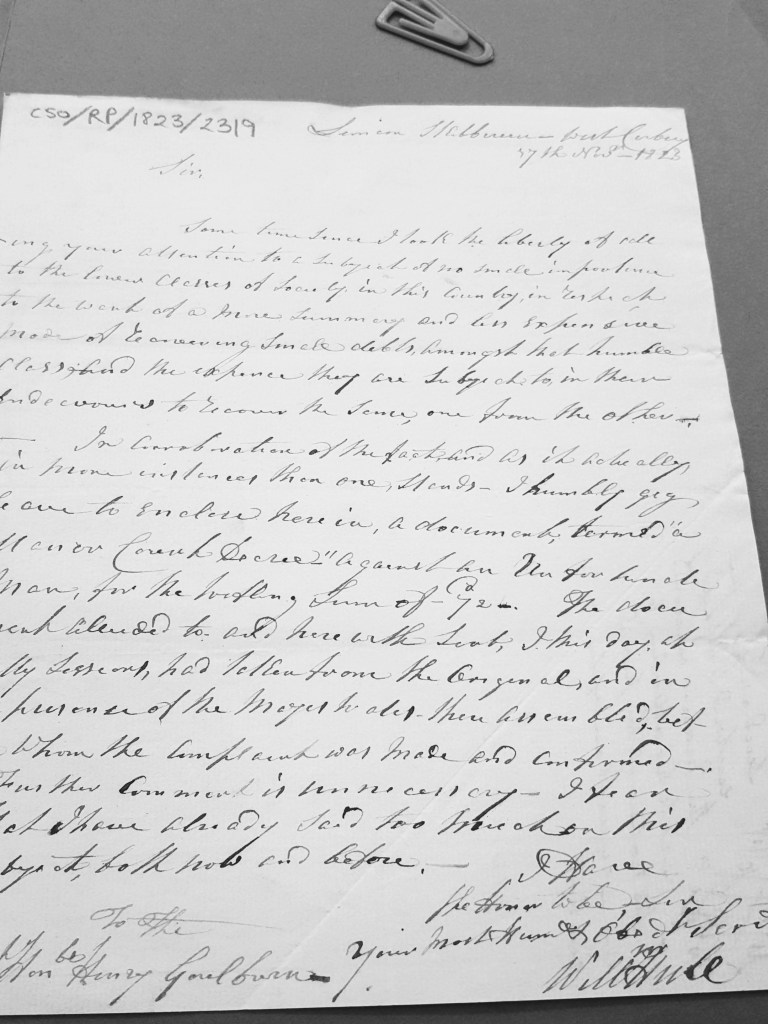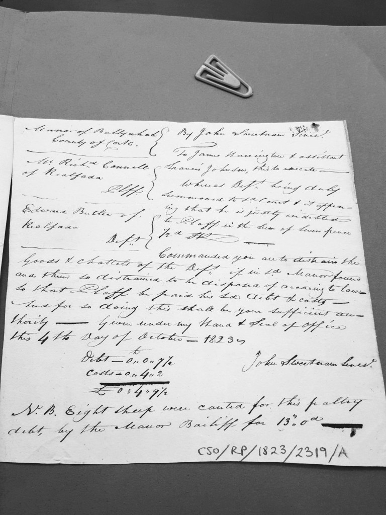 Manor Court Decree” taken by Richard Connell against Edward Butler, both of Kealfada, County Cork, demonstrating that the legal costs far outstrip the amount of the original debt; decree originally signed by John Sweetnam, seneschal [of Aghadown and Schull Manors], 4 October 1823.
