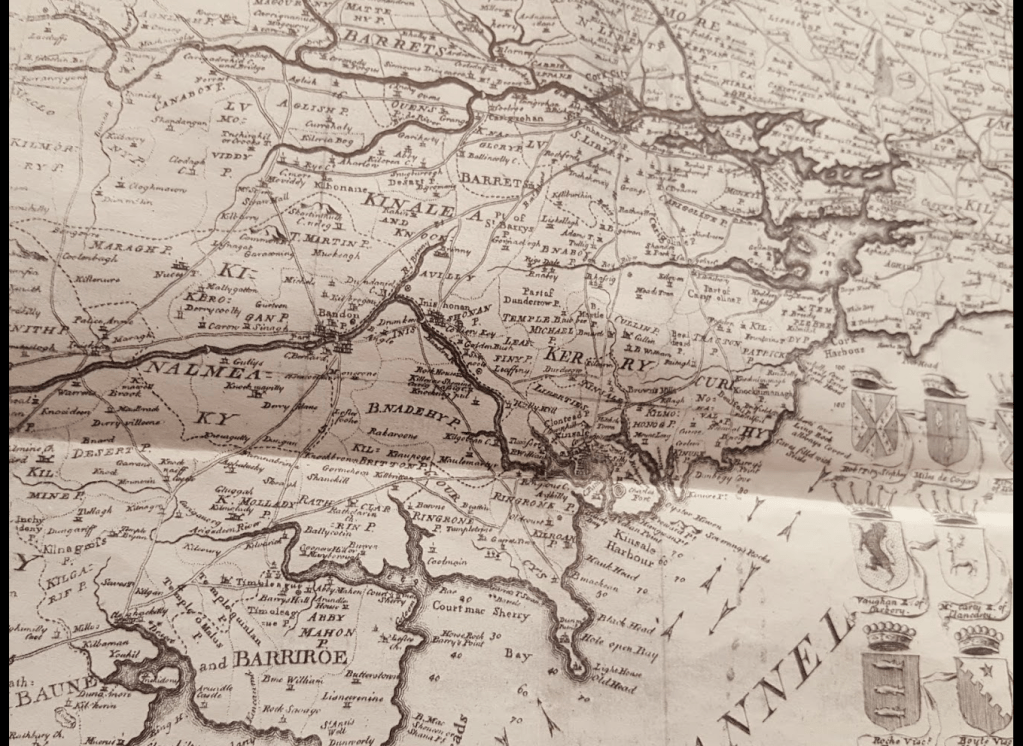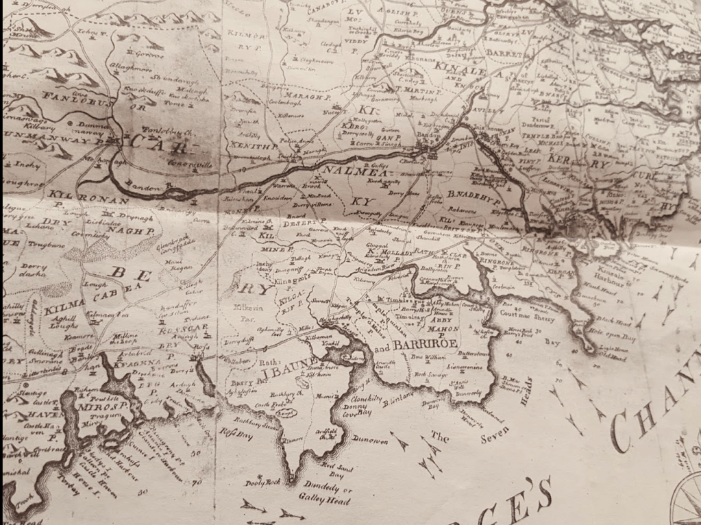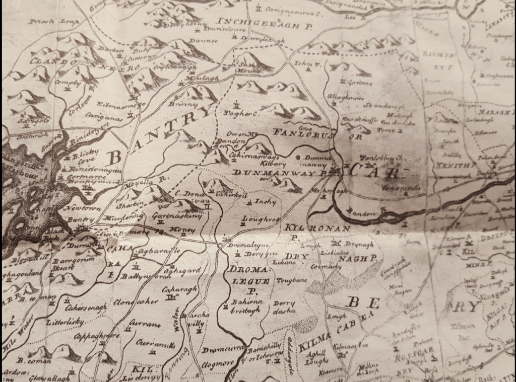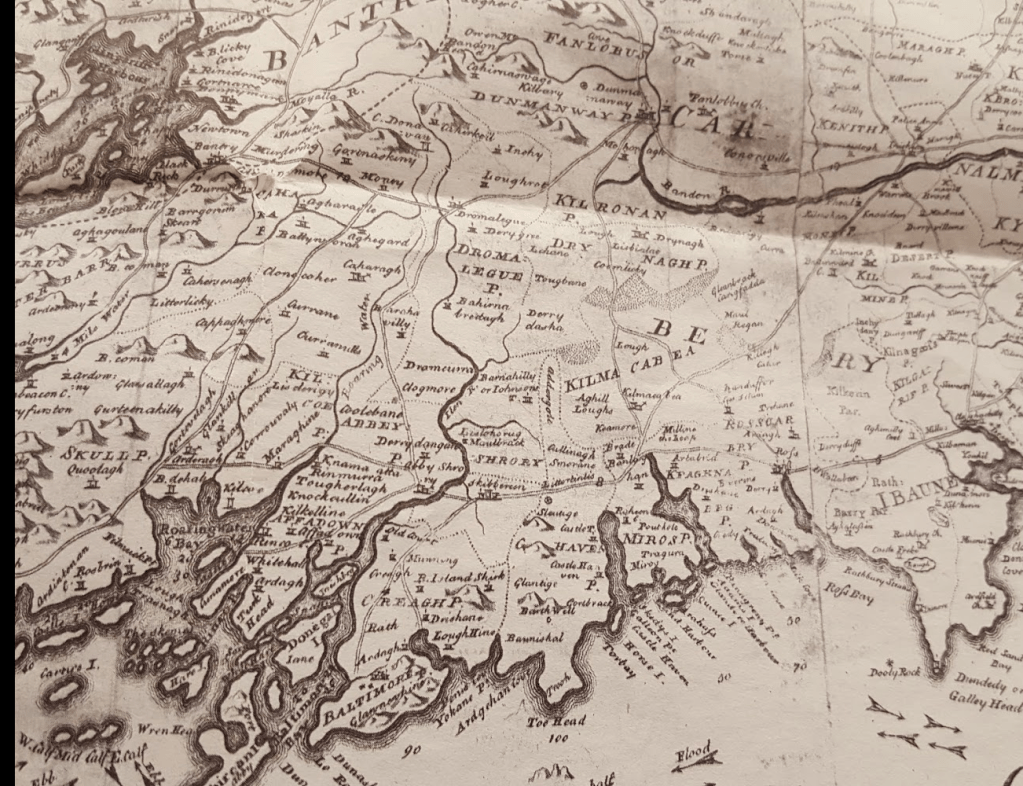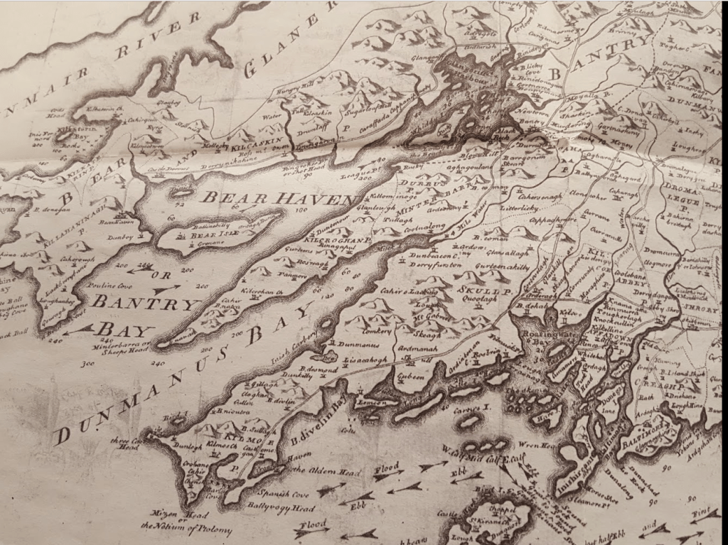 Francis Jobson’s Map of West Cork, 1589 including Cape Clear (Iniskyran), Baltimore, O’Driscolls, Rosbrin, Crookhaven, Bantry, Muintervara land of Rymers (O’Daly’s Bardic School), O’Sullivan Bere, Priest’s Leap.