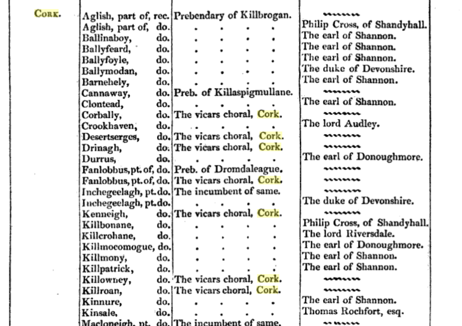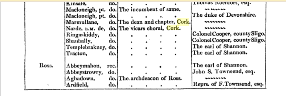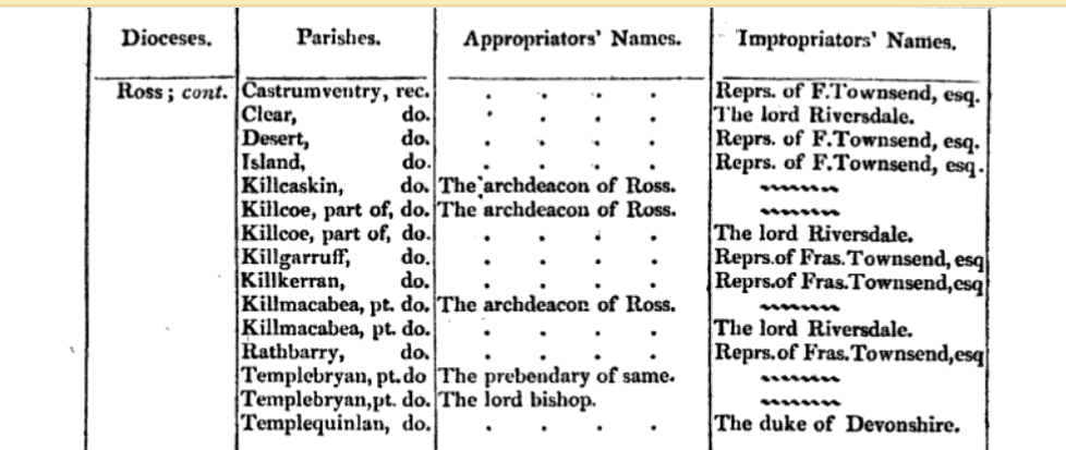 The common perception is that the tithes were owned by the Church of Ireland clergy. They certainly owned some but many were owned by lay impropriators non clerical. Here among those are the Duke of Devonshire, the Earl of Shannon who are descendants of Richard Boyle the Great Earl of Cork. He acquired many of the parochial tithes of Cork in the early 17the century. Lord Riversdale is of the extended Hull family of Leamcon, Schull associates of Boyle. Often the Clergy mortgaged or leased the tithes sometimes to wealthy Catholic businessmen.